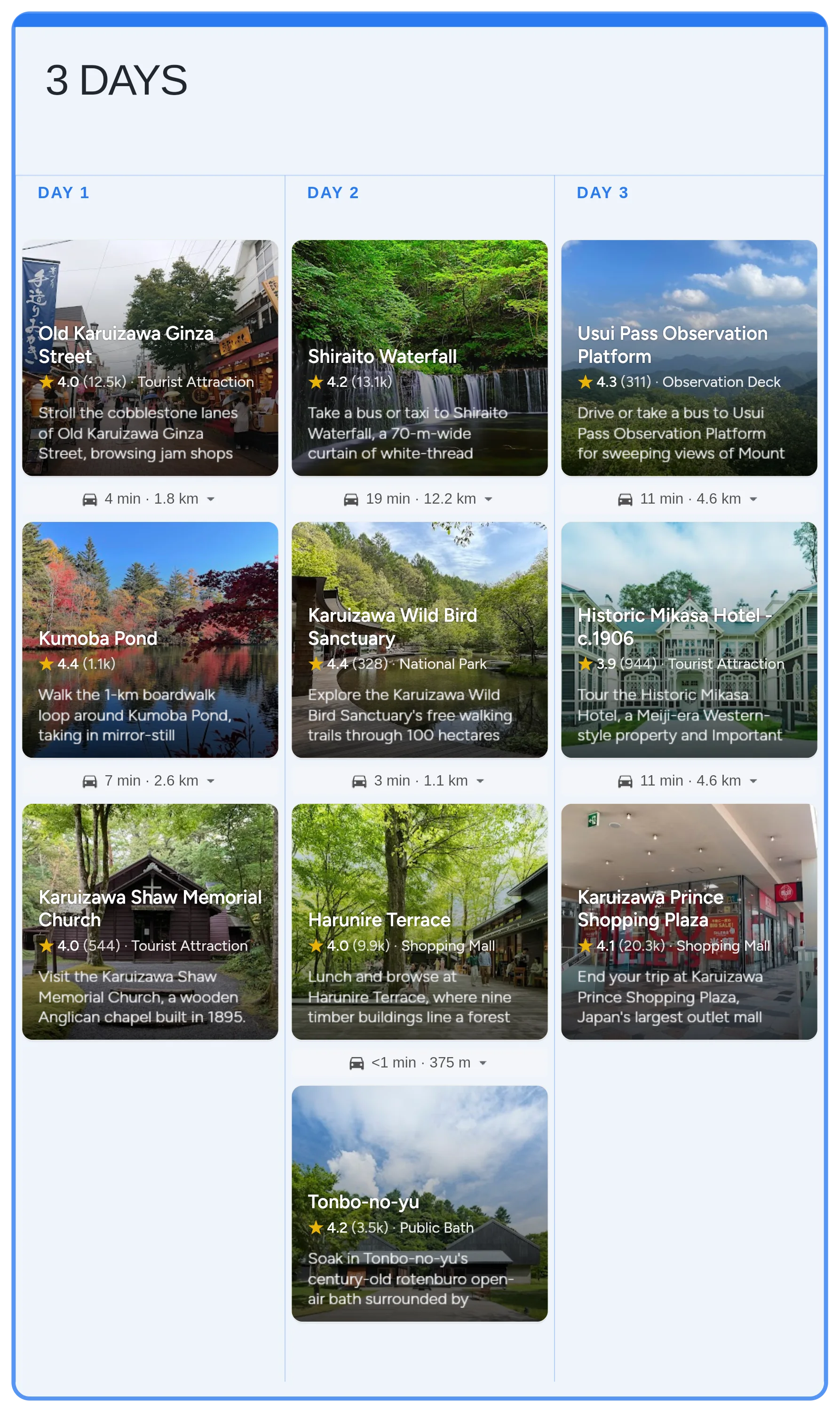 Build a 3-day Karuizawa trip around the Old Karuizawa Ginza cobblestone strip, a forest morning at Shiraito Falls, and panoramic views from Usui Pass on the final day. This itinerary clusters Day 1 around the Ginza lanes and Kumoba Pond reflections, Day 2 around Shiraito Falls, Harunire Terrace, and an evening soak at Hoshino Onsen Tombo-no-Yu, and Day 3 around mountain views at Usui Pass and outlet shopping beside the station. Summer brings lush greenery and cool air at 1,000 meters, autumn delivers vivid koyo foliage at Kumoba Pond and Shiraito Falls, and winter pairs steaming onsen with gentle ski slopes.