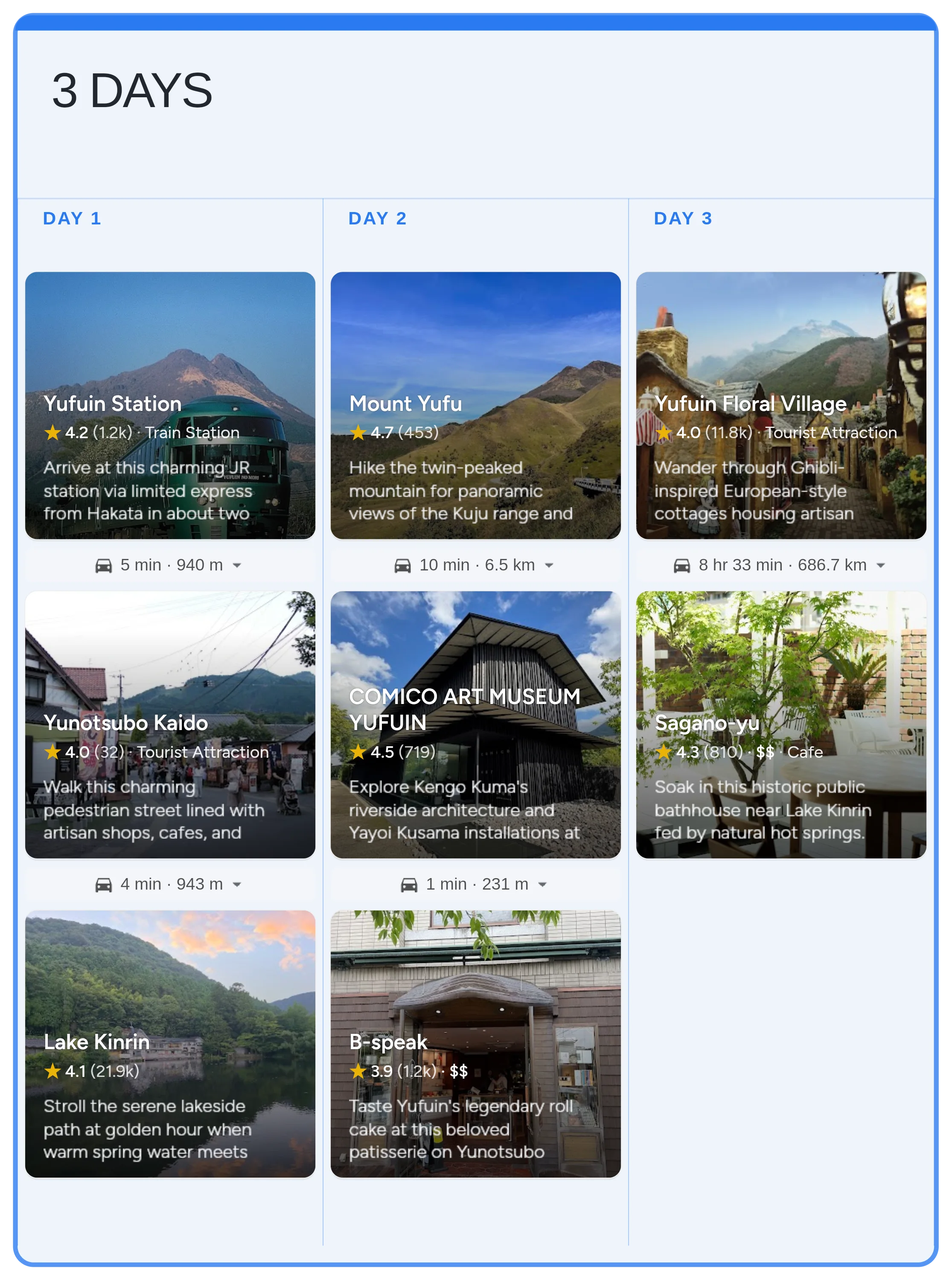 Build a 3-day Yufuin trip around Lake Kinrinko's misty shoreline, a morning hike up Mount Yufu, and an afternoon along Yunotsubo Kaido. This itinerary clusters Day 1 around the JR arrival, Yunotsubo Kaido snacks, and a golden-hour walk at Lake Kinrinko, Day 2 around a Mount Yufu summit hike and the Comico Art Museum, and Day 3 around Yufuin Floral Village and a final onsen soak before heading home. Winter brings morning mist over the lake and snow-dusted peaks, while autumn paints the surrounding forests in reds and golds.